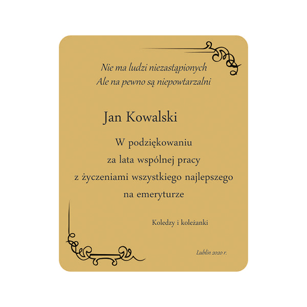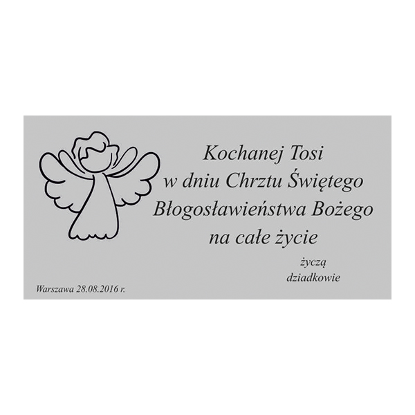 Tabliczki nagrobne, pamiątkowe, na statuetki, podziękowania, życzenia na chrzest, komunię, urodziny, odejście na emeryturę itp. Tabliczki okazjonalne to idealny pomysł na spersonalizowany prezent dla bliskiej osoby. W ofercie mamy szeroki asortyment tabliczek standardowych ale istnieje również możliwość wyboru rozmiaru, materiału.