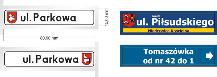 Proponowany system oznakowania zawiera m.in. tablice adresowe, z nazwami ulic, ostrzegawczo-informacyjne typu UWAGA PIES. Pozwalają one na odpowiednie oznakowanie przestrzeni publicznej, posesji, siedziby firmy czy instytucji. Poza standardowymi wzorami wykonujemy również tablice wg indywidualnych wytycznych Klienta. Do produkcji stosujemy różne techniki i materiały odporne na warunki atmosferyczne.
